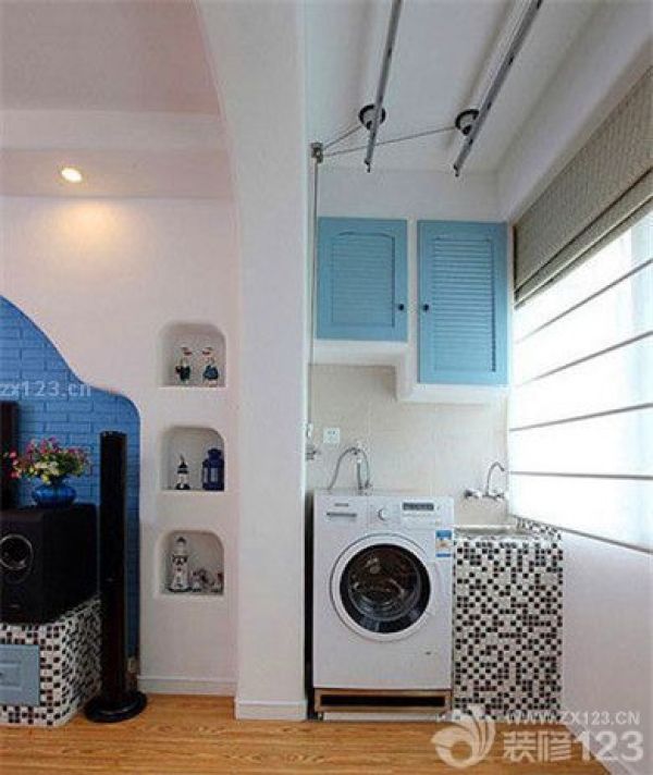 利用陽臺靠近下水道出口的特點,將洗衣機放置在陽臺上,配以放置洗衣粉及儲存臟衣物的吊柜和低柜,也能很好地利用陽臺。