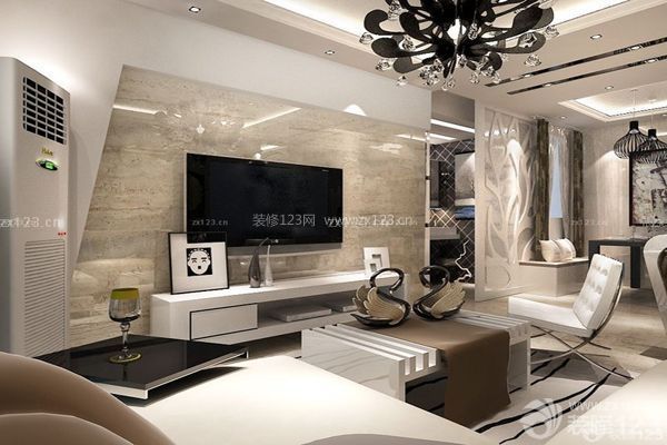 有業主會犯這樣的錯誤,在設計背景墻時,沒有考慮電視、沙發的位置,在完工后發現整體有點不搭。所以裝飾背景墻的時候,首先得確定沙發和電視機的位置,然后根據沙發的高度確定壁掛電視的高度,從而來設計電視背景墻。(沙發與電視機的距離最好是電視機尺寸的3~4倍,這樣才會讓整體顯得舒適美觀。)