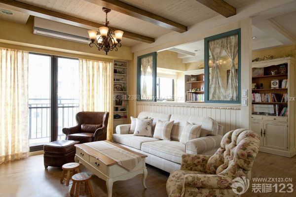 在燈具上適合選擇精致的鐵藝燈架,配上格子布藝燈罩,整個客廳洋溢著田園風氣息。