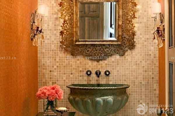 裝修tips:這個衛生間的復古色彩就更加濃郁了:淺色馬賽克墻面與明朗的橘色墻面組合,加以繁復鏤空花紋邊框的鏡面,在兩旁加以對稱的暖色小壁燈,讓這一空間顯出一種華貴范。青銅色的臺盆可謂是整個房間最吸睛的裝飾,復古韻味十足。