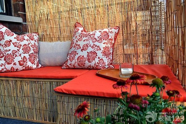 除了植物,陽臺的其余部分就是舒適的座位這樣你休息才能真正的高枕無憂。不要認為好座位的選擇必須是昂貴的,下面的長椅是利用塑料存儲箱、膠合板和蘆葦柵欄制作的。