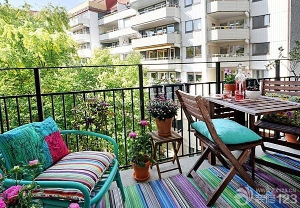 別忘了,你還可以利用顏色和圖案豐富你的陽臺,下面這個特色空間,一個藍綠色的坐墊、一身條紋的長椅以及豐富多彩的地毯。