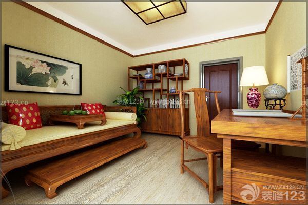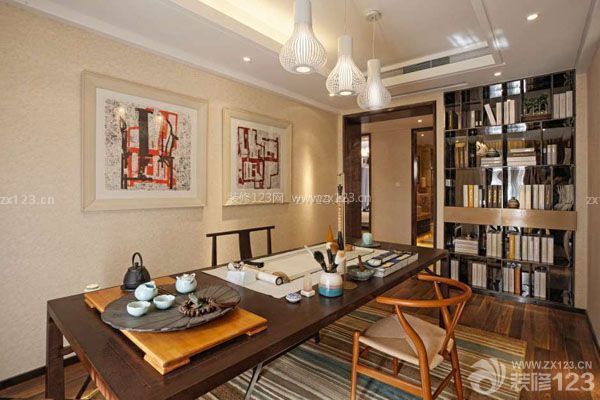 大型的書架收納了整面墻壁的書,還設(shè)置了屏風(fēng)樣式的隔斷,是一個(gè)很好的家居裝飾,凸顯古色古香的優(yōu)雅特點(diǎn)。