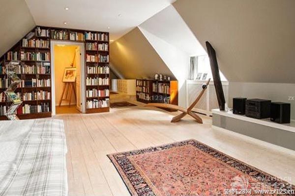 如果主人計劃將不規(guī)則的房間改造成書房,可根據(jù)墻的高度做一個階梯書架,漸漸下落的階梯和傾斜的墻面能夠形成漂亮的弧線,空間會變得開闊起來。如果屋頂傾斜度太大,可以考慮安裝地臺改造成休閑區(qū),在地臺上隨意地擺幾個靠墊,邀親朋好友在這里喝茶、聊天也是一種享受。