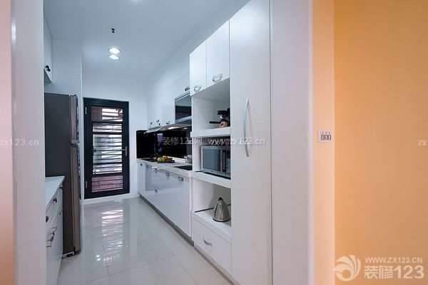 廚房背景墻為黑色馬賽克格子圖案,跟普通的大白墻相比,更具設計感。瓷磚的材質也讓廚房油污更好清理。廚具、餐具都被收納在櫥柜之中,廚房沒有一絲雜亂之感。現在沒有幾個男人能堅持每天下廚!廚房是女人的天下,廚房的布置也很重要,弄不好就容易下廚時手忙腳亂,油煙越來越多。同時,廚房也是最容易雜亂的地方,如果能做好分類規整,保持整潔,會讓整個空間顯得更寬敞。
