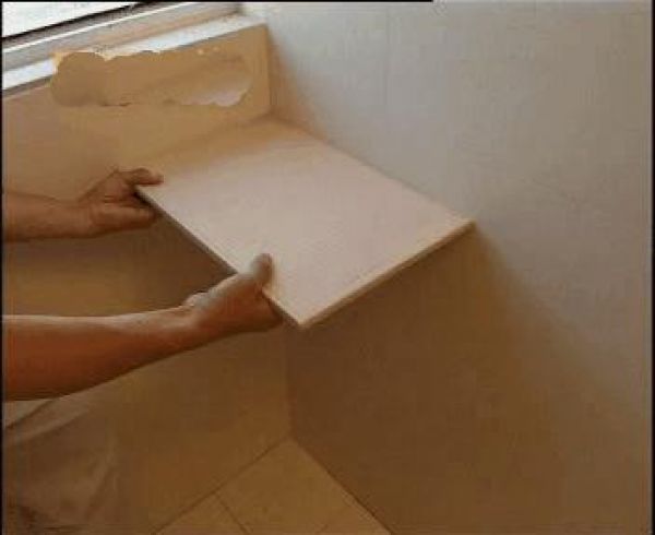 第二步:把滿批水泥的磚沿托板貼上墻,用橡皮錘敲打。