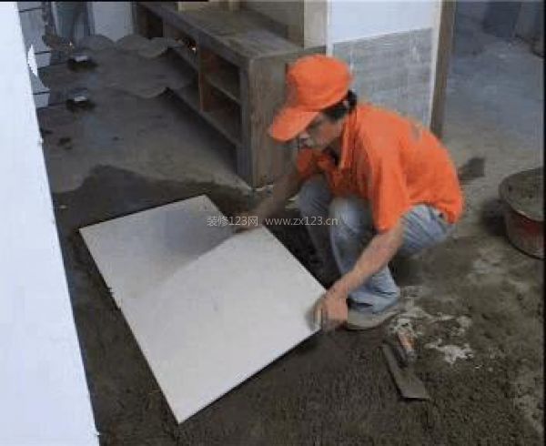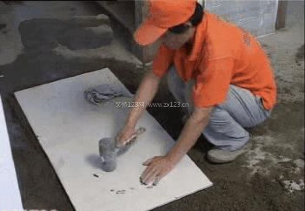 第六步:第二次拿起瓷磚,檢查地面砂漿是否已經(jīng)飽滿,有沒有縫隙,如果已經(jīng)飽滿和平整,在瓷磚上均勻地涂抹一層素水泥漿