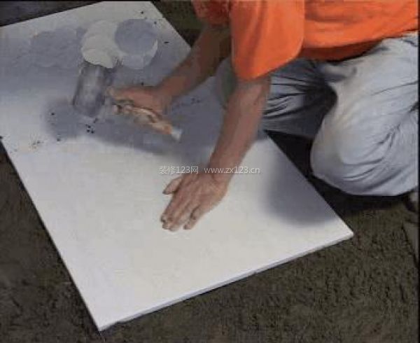第五步:第二次把瓷磚鋪上,敲打結(jié)實(shí)至和基準(zhǔn)磚平齊(相關(guān)閱讀:家居裝飾 地磚驗(yàn)三招“看、敲、潑”)