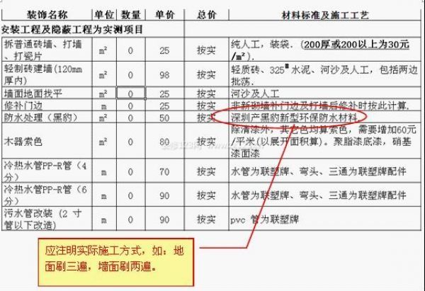許多業(yè)主在查看報價單的時候,只盯著數(shù)字看,對于文字說明很少關注,這是非常錯誤的做法,因為文字一般是作為條款補充而存在的,大都注明施工工藝和要求。有的裝修公司就會在上面做文章。比如刷墻,正常作業(yè)是刷3遍膩子粉,可文字說明上只有2遍,這樣下來就嚴重影響了你的裝修質量,而裝修公司卻平白的賺了你一筆錢,墻面掉漆、衛(wèi)生間滲水這些現(xiàn)象大都是施工質量不過關造成的。