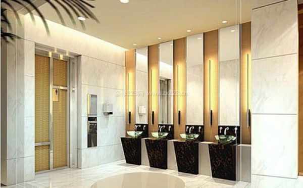 大堂的公用衛生間也是設計中的一個重點,應注意:衛生間的位置應隱蔽,開門不宜面直接對大堂,開門后應有過渡空間水嘴、小便斗建議用感應式,這樣比較衛生。干手紙箱及垃圾箱應嵌入墻體。坐廁應采用全封閉式,相互間的隔斷應到頂,以增加私密性。小便斗前及坐廁后可增加藝術品的陳設。搭配和諧的石材墻及地面可有效提升衛生間的檔次。洗手臺鏡前的壁燈對于照明及效果的體現亦很重要。