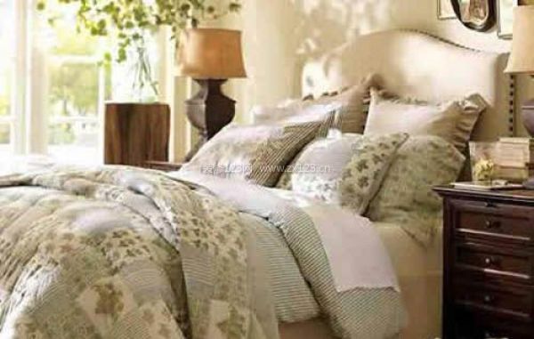 臥室這張大床從遠(yuǎn)處看來,好像床頭是藤制的材料,其實(shí)床頭真正的材料是布藝,只是有藤制品的圖案。