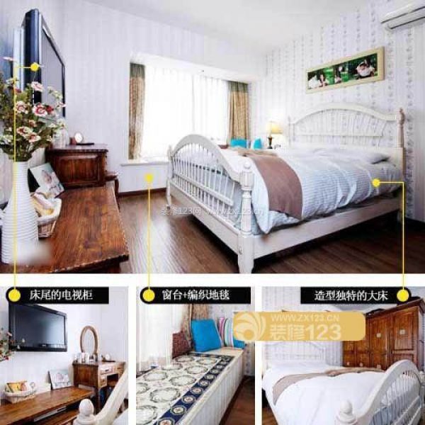 點(diǎn)評(píng):來(lái)到了主臥,白色的墻面都被粉飾過(guò)。整體基本上都延續(xù)了白色搭配深色地板和木制家具的設(shè)計(jì)。主臥安裝有電視,方便主人躺在床上,舒舒服服地欣賞電視節(jié)目。飄窗鋪上了波西米亞風(fēng)格的地毯,搭配上藍(lán)色的靠枕,真的很養(yǎng)眼。