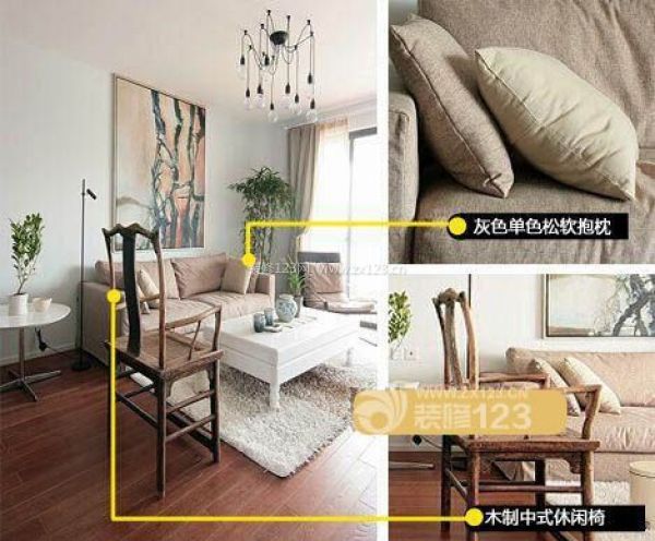 元素:灰色松軟抱枕+木制中式休閑椅