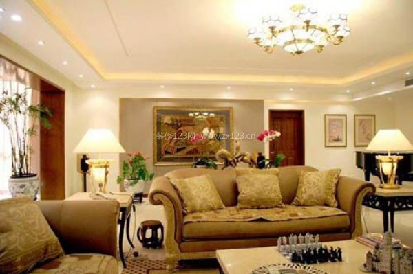 此款客廳設(shè)計(jì)具有濃烈的歐式風(fēng)格特色,采用暖色調(diào)的沙發(fā)與沙發(fā)背景墻在色彩上形成完美統(tǒng)一,渲染出客廳的高貴與奢華,沙發(fā)背景墻上的兩幅精美裝飾畫,提升了客廳的歐式整體氣質(zhì),柔和燈光灑在沙發(fā)背景墻上時(shí)客廳的空間立體感得到完美呈現(xiàn)。