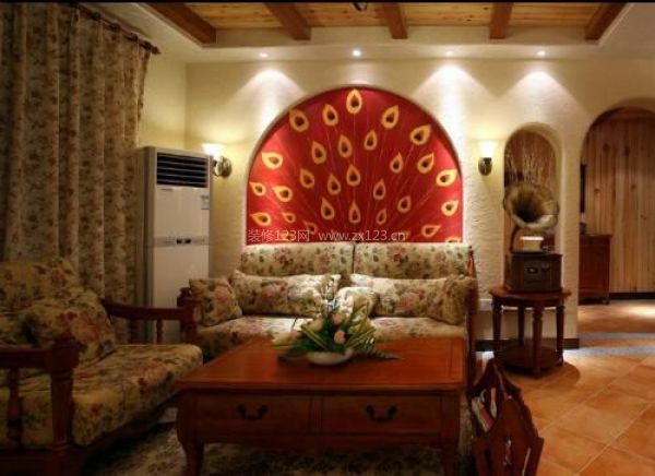 采用碎花布藝沙發(fā)和窗簾點(diǎn)綴出整個(gè)客廳的溫馨感,沙發(fā)背景墻采用紅色孔雀開屏圖案設(shè)計(jì),在柔和的燈光照射下,不僅能瞬間吸引人們的目光,而且更能將地中海風(fēng)格的質(zhì)感與柔美展露無遺,從而使客廳的整體氣質(zhì)得到極大提升。