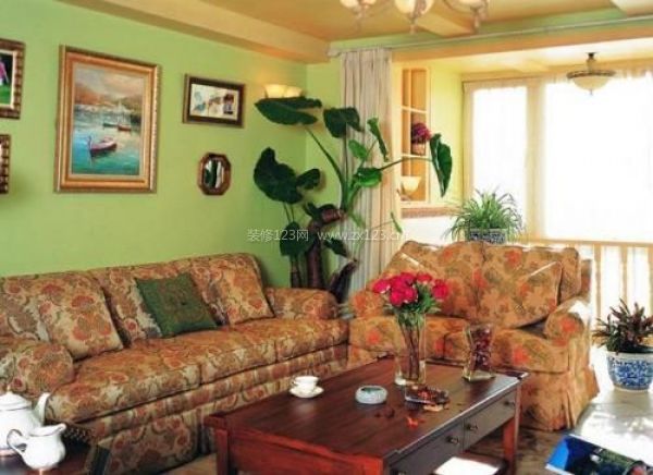 選用暖色調(diào)的花紋圖案布藝沙發(fā)裝扮客廳,為客廳增添了一股濃濃的溫馨氛圍,沙發(fā)背景墻采用綠色壁紙裝扮,瞬間使客廳傳遞出縷縷清新氣息。背景墻上懸掛的精美裝飾畫,與沙發(fā)背景墻在色彩上形成鮮明對比,仿佛正游走在山水之間。擺放一株綠色盆栽植物為客廳增添了些許生機(jī)與活力,仿佛感受著清新自然的田園氛圍一般。