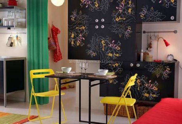 顏色在這里張揚,沒有害羞,更沒有吝惜。紅色、黃色、綠色、黑色在這里碰撞,還有花色的墻壁,簡單的兩人用餐桌餐椅顯得溫馨而浪漫,和廚房在一起便捷而美觀。