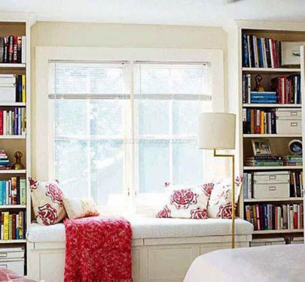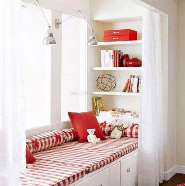 普通的窗戶也可以變身為飄窗的感覺。設(shè)計(jì)一個(gè)這樣的“凹”字形書架:兩邊放書,中間則設(shè)計(jì)成地臺(tái)一樣的假飄窗。這樣的設(shè)計(jì)是不是可以以假亂真了?