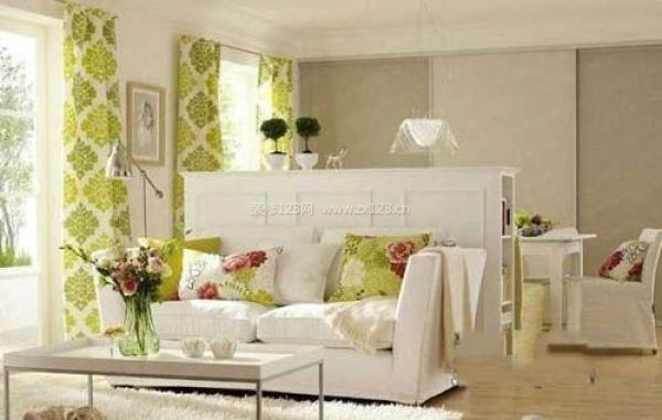 很唯美主義的一款客廳的裝修,整個客廳是否帶給人們一種純潔,春天的氣息。寬敞明亮的客廳空間采用精美的淡綠色布藝進行裝點,讓整個空間比較的靚麗富有色彩,在客廳和餐廳的交接處,設計了一個白色書柜式的臺面隔斷,將客廳空間和餐廳空間進行了小小的活動隔斷,不光迎合了整個客廳的需要,而且也方便了平時的閱讀,十分的方便!