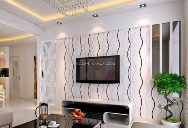 電視背景墻的裝飾,在現代的家居裝修風格中追求的是一種簡單與低調,不需要過多的裝飾去點綴,一張精美的壁紙足夠讓整個背景墻變得簡潔,漂亮。豎條紋的波浪線精美壁紙,拉伸了整個視覺空間,而以白色為底色的壁紙,是客廳的空間感明亮了不少。