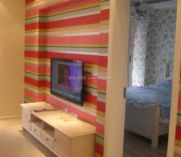 電視墻的墻紙我顏色選得大膽。哈哈。適合女生吧。單拍的電視墻。電視柜是田園風格的。