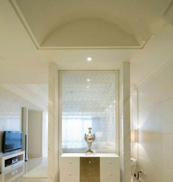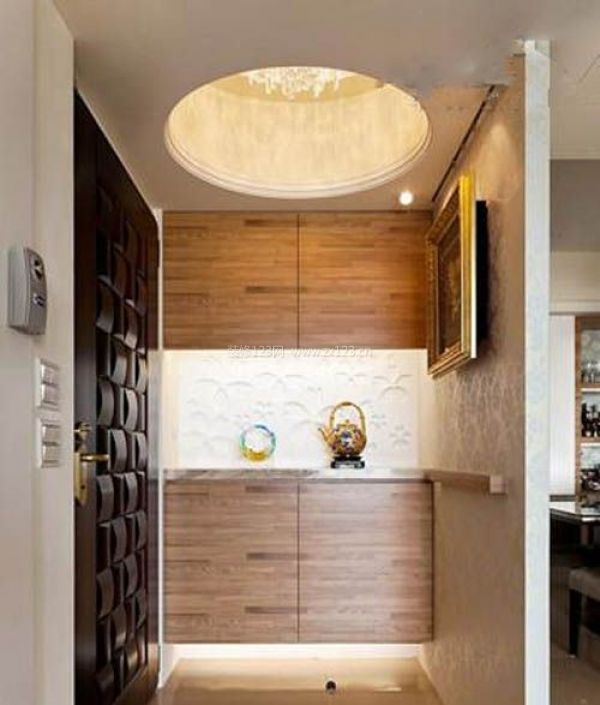 這個設計是適合家里有比較多的吊頂設計,看得出來這個圓形造型做得比較深,如果客廳處有對應相似的吊頂的話,整體看起來會很有層次感,圓形造型的燈光襯托,會讓整個玄關顯得高很多。
