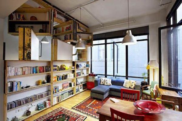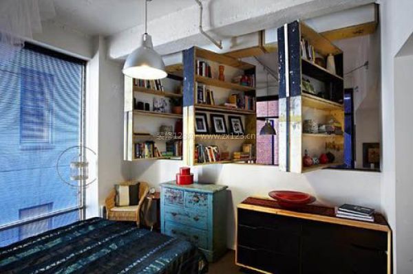 將書架完全轉(zhuǎn)到臥室這一邊,效果也非常好,不過為了兼顧臥室的裝飾需求,這幾面書架最好重點(diǎn)突出收藏品,因?yàn)樵谂P室擺放過多的書籍可能會(huì)造成空間的過渡壓抑。