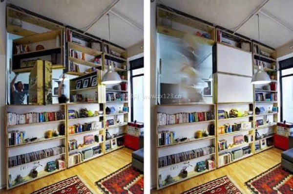 客廳的另一邊是臥室,書架旋轉(zhuǎn)過來后同時(shí)也可以滿足臥室的閱讀和裝飾需求。為了照顧臥室擺放家具的需求,設(shè)計(jì)師在設(shè)計(jì)這個(gè)書架的時(shí)候,并沒有將整面墻都打掉,而只是將墻面的上面部分做成了旋轉(zhuǎn)書架。如果你的家開間夠大,需要保存的書籍夠多,完成可以獨(dú)立做成整面墻的旋轉(zhuǎn)書架設(shè)計(jì)。 書架完成充當(dāng)墻面,根據(jù)需求來選擇是將兩個(gè)空間開放還是閉合。