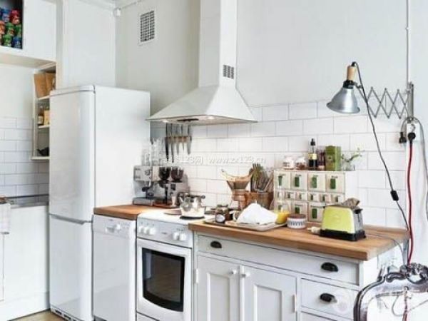 小面積公寓廚房一般都是按小尺寸的冰箱制定出空間。不妨給大冰箱制作一個外衣箱,側面可以適當點綴一下,看起來整潔美觀。
