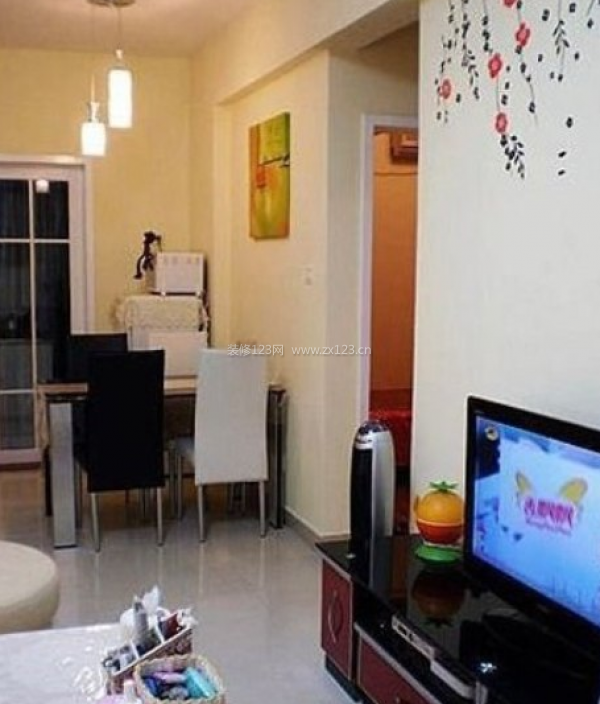 這個角度可以看見電視背景墻上方的手繪小花,燃空間顯得十分生動有活波。餐廳上的吊燈是業主自己買的。而簡易的餐桌能夠容納一家人,微小的餐桌不但能保證基本的功用,還拉近一家人的距離。