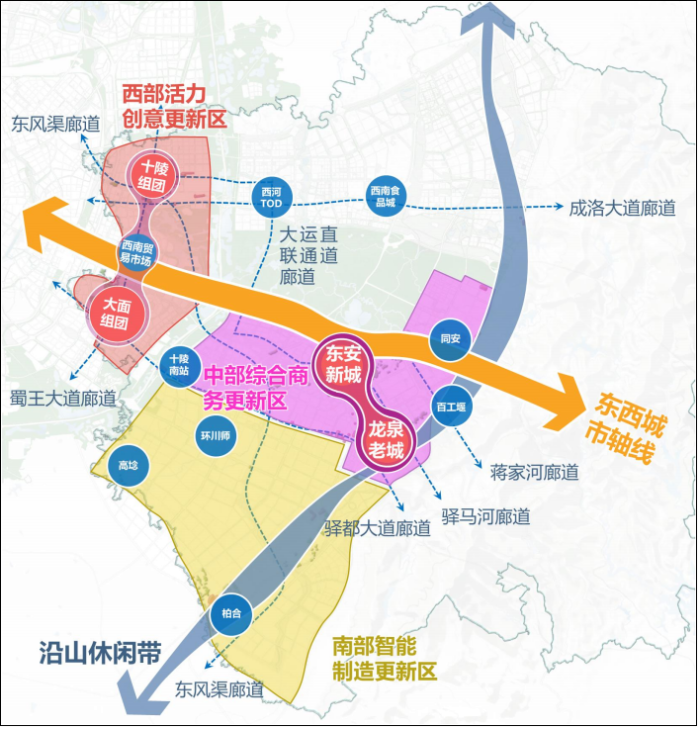 四組團(tuán):龍泉老城組團(tuán)、十陵組團(tuán)、大面組團(tuán)、東安新城組團(tuán)。