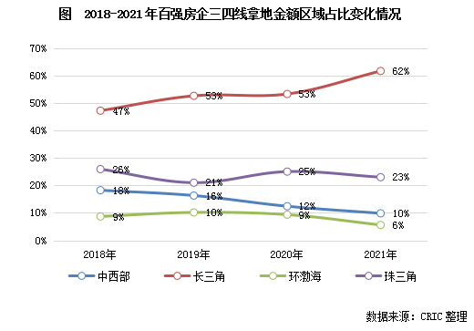 在三四線拿地金額分布的變化上,房企對(duì)不同區(qū)域的偏好程度出現(xiàn)了較大差異,投資結(jié)構(gòu)也發(fā)生明顯改變:自2018年以來,房企在長(zhǎng)三角的投資占比持續(xù)增加,2021年長(zhǎng)三角區(qū)域的占比達(dá)到62%,較2020年增加9個(gè)百分點(diǎn),較2018年更是大幅提升15個(gè)百分點(diǎn)。