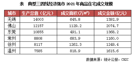這些城市商品住宅市場(chǎng)成交規(guī)模亦處于同能級(jí)前列,其中佛山得益于廣佛同城帶來的大量需求導(dǎo)入和購(gòu)買力支持,其成交金額更是達(dá)到了2074億元,超過了合肥、長(zhǎng)沙、濟(jì)南等二線城市。無錫、東莞、常州等城市2021年下半年市場(chǎng)成交熱度雖大幅降溫,但在大規(guī)模的經(jīng)濟(jì)體量之下,城市的住宅需求總量依舊處于三四線前列,全年的商品住宅成交金額仍可保持在千億水平以上。
