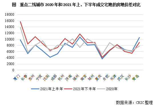 在拿地成本下降的背景下,多數(shù)城市的房?jī)r(jià)保持穩(wěn)定,部分限房?jī)r(jià)的城市如杭州、成都、長(zhǎng)沙、寧波等還在第三輪集中供地中進(jìn)一步上調(diào)了商品住宅銷售限價(jià),房地價(jià)差空間被進(jìn)一步擴(kuò)大。17個(gè)城市中,約七成的城市在2021年下半年成交涉宅地的房地價(jià)差明顯高于上半年,僅長(zhǎng)沙、青島等少數(shù)城市因成交結(jié)構(gòu)更偏向房?jī)r(jià)較低的郊區(qū)而導(dǎo)致房地價(jià)差空間縮小。再與2020年相比來看,仍有過半的城市在2021年下半年的房地價(jià)差水平超過2020年,利潤(rùn)空間明顯擴(kuò)充。