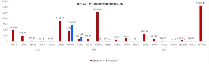 據(jù)有關(guān)數(shù)據(jù)顯示,8月1日-8月7日,成都商業(yè)市場(chǎng)錦江區(qū)等主城銷(xiāo)量大漲,天府新區(qū)等近郊供銷(xiāo)雙降,都江堰等遠(yuǎn)郊銷(xiāo)量穩(wěn)居上升。上周(8.1~8.7)亮點(diǎn)為都江堰區(qū)域銷(xiāo)售面積直線(xiàn)上線(xiàn),成功“出圈”,具體如下: