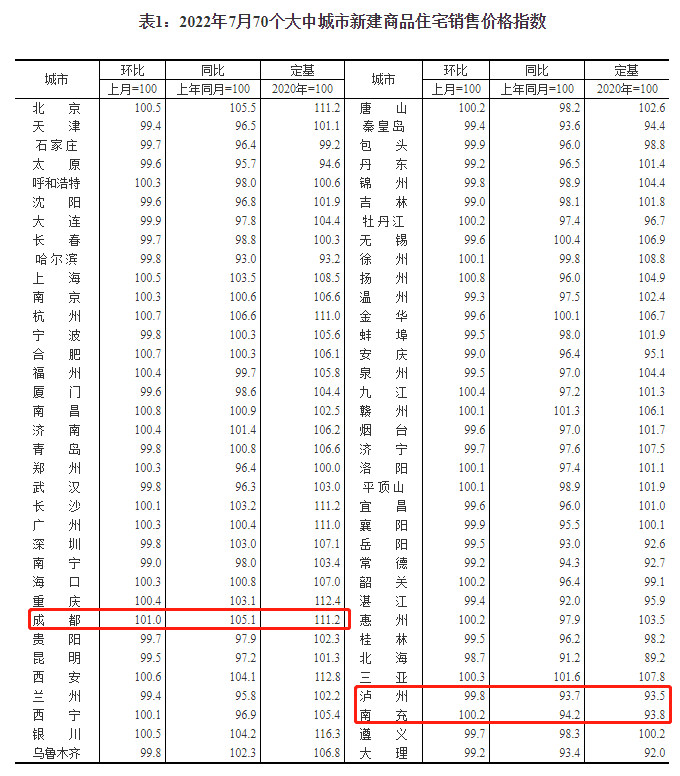 國(guó)家統(tǒng)計(jì)局發(fā)布了2022年7月份70個(gè)大中城市商品住宅銷售價(jià)格變動(dòng)情況。