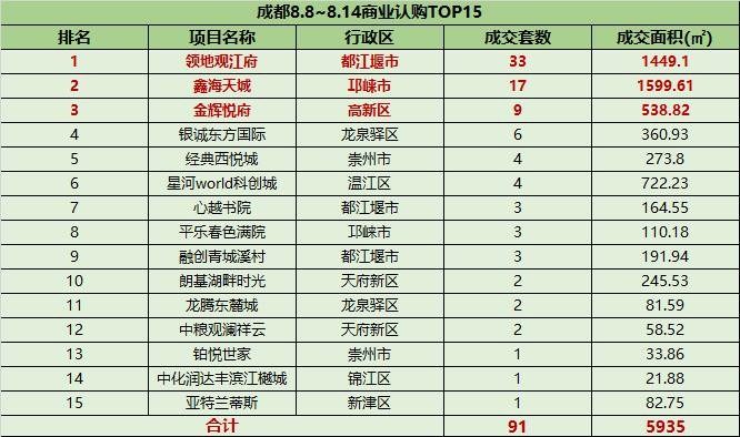 據數據顯示,2022年8月8日~14日,成都商業TOP15銷售面積為0.59萬㎡ ,主城2個 ,近郊5個 ,遠郊8個 。值得一提的是,領地觀江府、鑫海天城、金輝悅府優躍因備受購房者青睞,順利成為榜單前三位,具體如下: