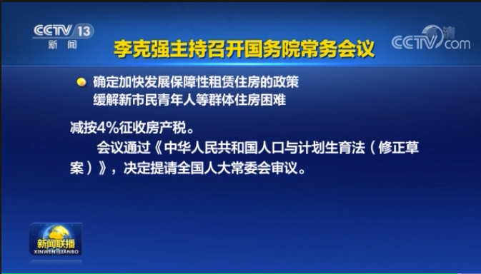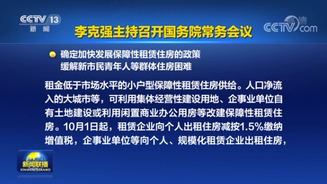 6月18日,國務(wù)院總理李克強主持召開國務(wù)院常務(wù)會議,決定從10月1日起,住房租賃企業(yè)向個人出租住房適用簡易計稅方法,按照5%征收率減按1.5%繳納增值稅;對企事業(yè)單位等向個人、專業(yè)化規(guī)模化住房租賃企業(yè)出租住房,減按4%稅率征收房產(chǎn)稅。