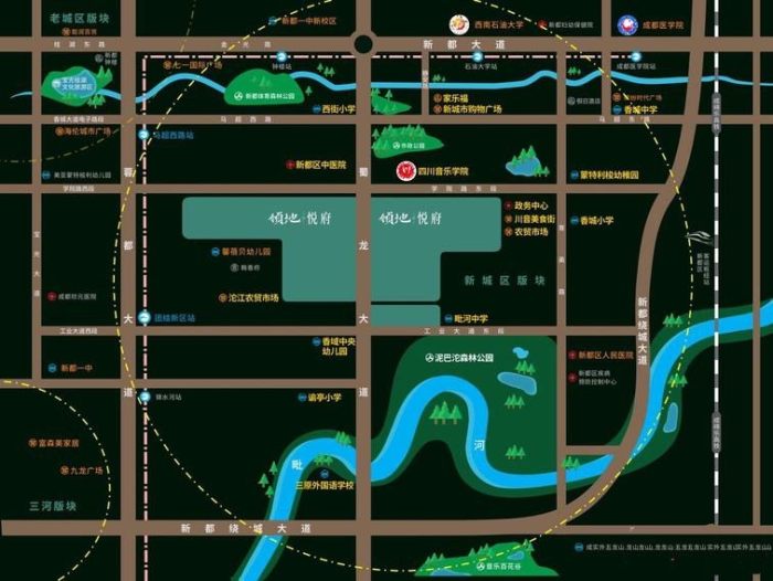 地處政府重點打造的俠客島-川音文創園,該項目坐擁立體交通體系帶來的便利交通和成熟商業配套,未來在領地悅府附近將形成新城區的高品質消費商圈。醫療資源有成都市新都區中醫醫院、新都區人民醫院、成都市新都區婦幼保健院等,保障家人健康。區域內還有新都利民學校、升庵中學、成都上美藝術學校、四川音樂學院(新都校區)、成都市新都區特殊教育學校等多所學校,護航孩子成長。公園配套有新都體育森林公園、新都區中央森林公園、毗河音樂文創公園、馬超東路市政公園等,生態資源豐富。住在這里,既可享受城市中心的繁華生活,又可以擁有靜謐安逸的生態生活。